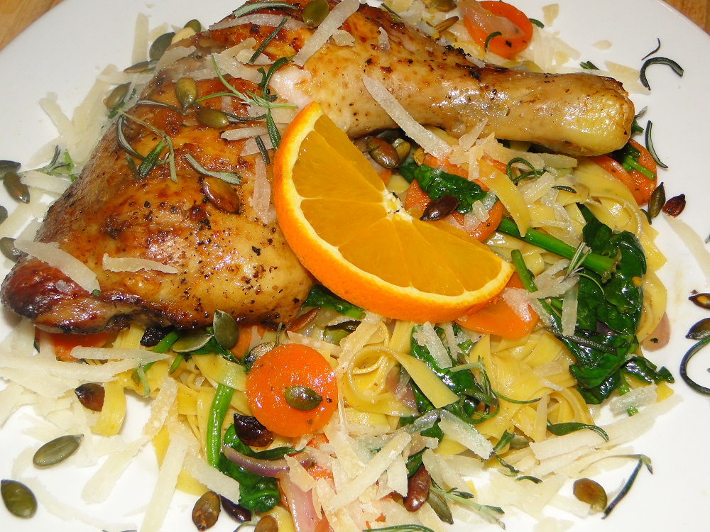 Eggpasta med appelsin, servert med spinat, gulrot og geitost, som tilbehør til grillet kyllinglår.