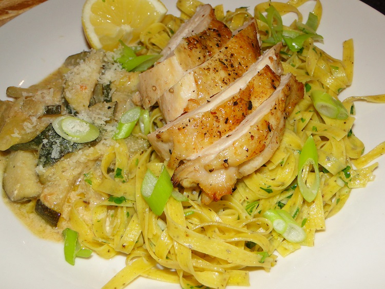 Eggpasta med salvie, smørstekt squash og kyllingbryst