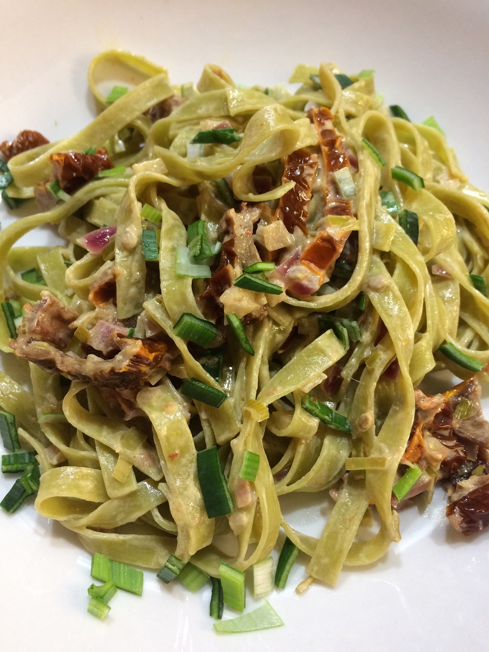 Eggpasta med spinat, kokt i 2 minutter, rørt sammen med soltørret tomat, rødløk, vårløk og en riktig god olivenolje. Ekte og veldig enkel hurtigmat.