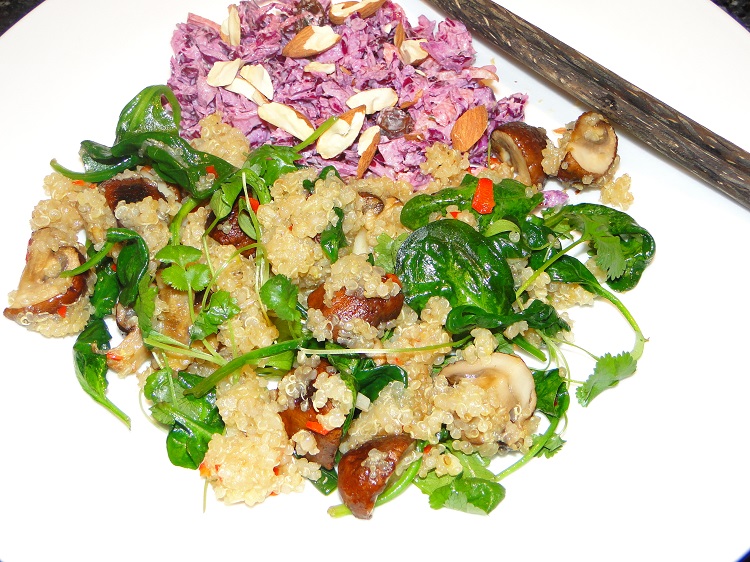 Kok i 15 min. Skjær soppen i båter og rist først i tørr wok til de begynner å krympe, tilsett så olje, hvitløk og chili. Rør godt, tilsett kokt quinoa og spinat. Rør til alt er varmt, ha over kvernet pepper og server med friske urter.